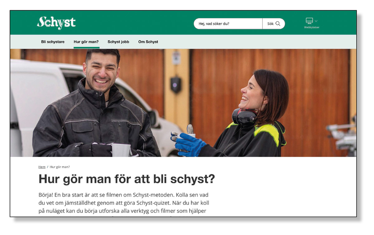Schyst ger inspiration och tips för den som vill komma i gång med sitt jämställdhetsarbete. På nya schyst.se finns något för alla – enkla övningar, inspirerande exempel, filmer, steg-för-steg, interaktiva verktyg och underavsnitt om bland annat schyst kommunikation, schyst idrott, schyst arbetsplats och schyst rekrytering. Här får du hjälp att bli medveten om normer och stereotyper, och du får handfasta tips på hur du kan arbeta för ökad inkludering och jämställdhet.